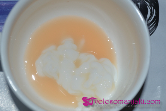 Stufe 2. Wir tupfen die Haare mit einem Handtuch ab und bereiten eine Mischung aus einer guten professionellen Maske und Ampullen vor. Ich nehme eine Portion (auf einmal) der Goldwell Regenerationsmaske und füge eine halbe Ampulle Lotion hinzu (auf das Haar direkt unter den Schulterblättern), mische alles gründlich und trage es auf das Haar auf, wobei ich 10 . von den Haarwurzeln zurück gehe -15 cm.Für eine bessere Anwendung verwende ich einen Pinsel zum Auftragen von Farbe.