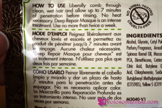 Die Maske wird in den USA hergestellt und ist weltweit sehr beliebt und in einem Volumen von 30, 100, 250, 500 und 1000 ml erhältlich. Der Geruch der Maske ist chemisch, säuerlich, ich kann nicht einmal feststellen, wie sie riecht, weder nach Obst noch nach Süßigkeiten. Nach dem Waschen bleibt der Geruch tagsüber und manchmal bis zur nächsten Wäsche auf den Haaren, aber nicht so aufdringlich wie sofort.