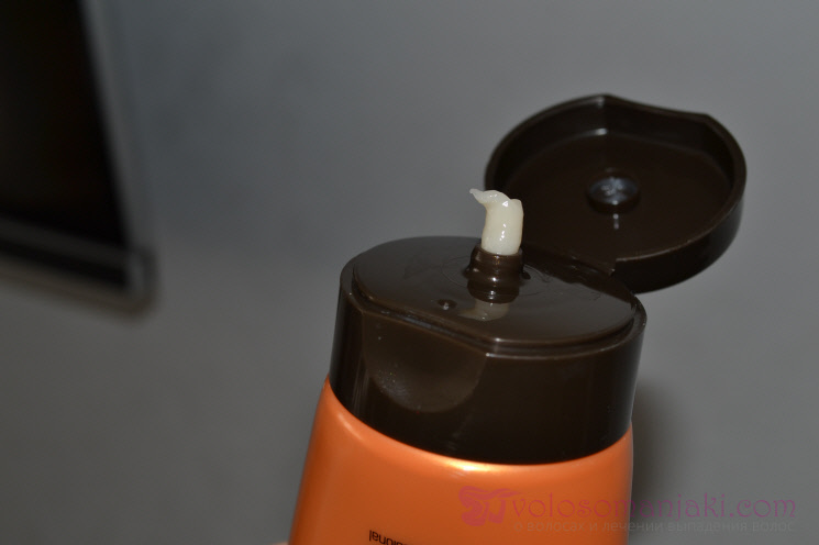 Die Maske wird dick, obwohl sie sich problemlos im Haar verteilt, "frisst" mein Haar sie buchstäblich in einer Sekunde. Das erste Mal habe ich es viel aufgetragen, aber es hat angefangen, meine Haare zu beschweren, also übertreibe es nicht.