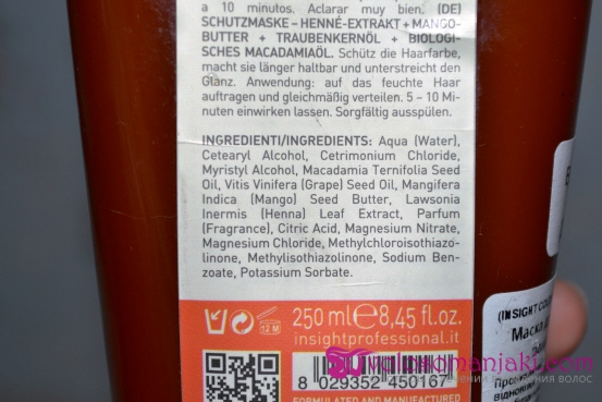 Die Zusammensetzung der Maske ist gut, sie enthält Henna-Extrakt, Macadamiaöl, Mango- und Traubenkernöl. Die Maske ist frei von Silikonen, Parabenen, Sulfaten und Farbstoffen, die Produkte werden nicht an Tieren getestet und es werden keine Inhaltsstoffe tierischen Ursprungs verwendet.