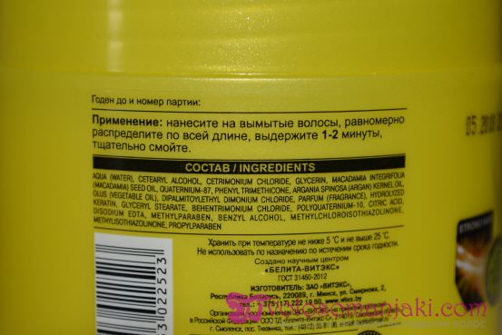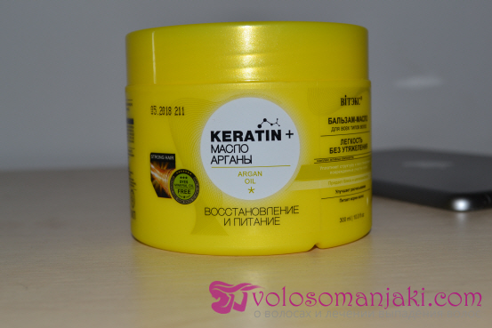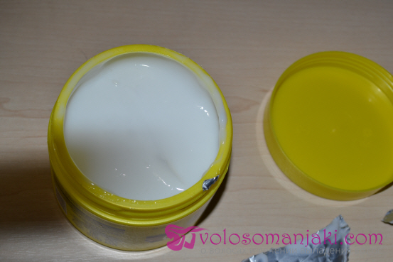 Der Balsam wird in ein gewöhnliches Plastikglas gegeben, es gibt eine Schutzmembran, die den Balsam vor dem Ausfließen schützt, ich mag diese Formen von Haarprodukten nicht, es ist unbequem zu öffnen, es ist unbequem, den Balsam zu nehmen, besonders mit nassen Händen, aber das sind solche Nachteile, mit denen man leben kann, wenn man selbst das Produkt für das Haar geeignet ist.