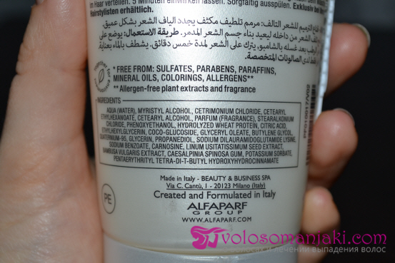 Die Marke Alfaparf existiert seit mehr als dreißig Jahren auf dem Weltmarkt für Haarprodukte, verfügt über eigene Forschungslabore und Produktionsstätten und vertreibt ihre Produkte in 80 Ländern der Welt. Das Image und die Bewertungen der Marke sind recht gut, was mir als Grundlage für die Wahl einer neuen Haarpflegelinie diente. Ich habe das Shampoo aus der Serie gegen Haarausfall gewählt, um das Haarwachstum zu stimulieren, und die Maske aus der regenerierenden Serie, von der ich euch heute erzählen werde. Ich war auch davon fasziniert, dass die Maske keine Sulfate, Parabene, Paraffin, Mineralöl enthält!