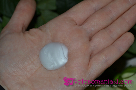 Über Shampoo. Das Shampoo ist in einem recycelbaren Plastikbehälter untergebracht, hat eine Schutzkappe und ist recht einfach in der Anwendung. Das Shampoo hat ein Volumen von 300 ml, es hat eine dicke Konsistenz, das Foto zeigt, dass es sich nicht ausbreitet, eine perlmuttartige Farbe und ein Kräutergeruch.