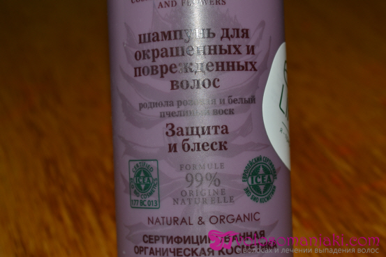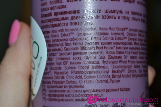 Das Shampoo hat eine transparente flüssige Konsistenz mit einem rosa-lila Farbton und einem erstaunlichen Zitrusaroma. Das Produkt ist mit weißem Bienenwachs gesättigt, wodurch das Haar gestärkt wird, gepflegt und gesund aussieht. Darüber hinaus ist es mit Rosen-Radiola-Extrakt angereichert - diese Komponente trägt dazu bei, das Haar auf natürliche Weise zu schützen, zu nähren und zu hydratisieren sowie die Regenerationsprozesse zu stimulieren. Dahurian Sojaextrakt teilt wertvolles Protein mit dem Haar. Natürliche Aminosäuren wirken als schäumende Basis.
