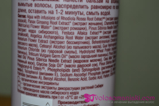 Komposition: Wasser, ein Derivat aus Rapsöl, Palmöl, Guarkernmehl, Weizenproteine, Extrakte aus Rhodiola rosea, Ginseng, Immortelle, Linnaeus, Kamille, Weizenkeimöl, Daurian Sojabohne, Zedernmilch, weißes Bienenwachs, Vitamine A, E, C, pflanzliche Ceramide, Parfümkomposition. Die Basis des Balsams sind Pine Oil Polyglyceryl-6 Ester, die durch lange und sorgfältige Verarbeitung von seltenem sibirischem Zedernöl gewonnen werden. Zedernnussöl enthält 5-mal mehr Vitamin E als Olivenöl und 3-mal mehr Vitamin F als Fischöl. Die Zusammensetzung der Shampoos und Balsame von Natura Siberica Cosmetics umfasst nur organische Extrakte, die die Ecocert-Zertifizierung bestanden haben, und die maximale Menge an natürlichen natürlichen Extrakten aus Pflanzen, die in den Reservaten des Fernen Ostens und Sibiriens wachsen. Enthält keine Bestandteile, die vom Körper als Allergene wahrgenommen werden können. Cosmetics Natura Siberica ist biologisch und vom unabhängigen Kosmetikinstitut ECO BIO ICEA (Italien) zertifiziert. Das Zertifikat garantiert, dass: mindestens 95 % der Zutaten pflanzlichen Ursprungs sind; enthält Extrakte und Öle aus kontrolliert biologischem Anbau; Es werden keine petrochemischen Produkte, Silikone, Parabene, künstliche Farbstoffe verwendet.