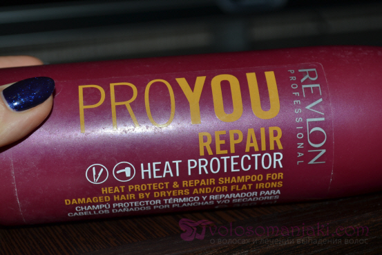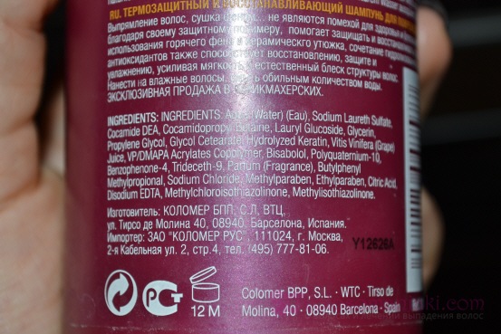 Die Zusammensetzung des Produkts enthält ein spezielles Schutzpolymer, das hilft, die Haarstruktur nach der Verwendung einer Vielzahl von heißen Friseurgeräten zu schützen und wiederherzustellen. Ich sage gleich, dass ich nicht wirklich an die Wärmeschutzeigenschaften von Shampoos und sogar an Wärmeschutzmasken glaube, schon allein, weil wir sie abwaschen, daher verwende ich auf jeden Fall vor jedem Trocknen mit einem Fön ein Wärmeschutzmittel, die meisten oft ist es eine Creme, weil nicht so viel Alkohol drin ist wie in einem Spray.