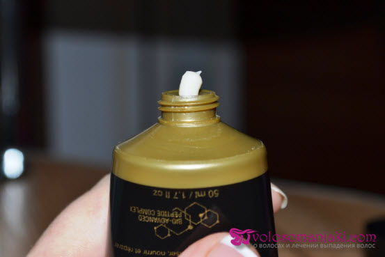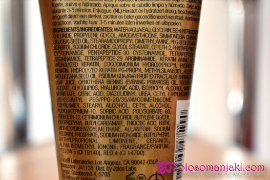 Die Komposition ist einfach etwas, ich hatte eine gewisse Anzahl von Masken und ich achte immer auf die Komposition und keine davon hat eine so große Komposition. Hier finden Sie 19 Aminosäuren, aus denen die natürlichen Proteine des menschlichen Haarkeratins bestehen, und biomimetische Peptide, Jojobaöl (an sechster Stelle, was auf seine signifikante Menge in der Maske hinweist), Aloe-Extrakt, Vitamin E, Guaven-Extrakt , mehrere Keratin-Derivate (die Basis des Haares, es besteht zu 97% aus Keratin), Keratin-Hydrolysat, natürlich verschiedene Arten von Silikonen, ohne sie gibt es auch nirgendwo und viele, viele Dinge nützlich und nicht so viel.