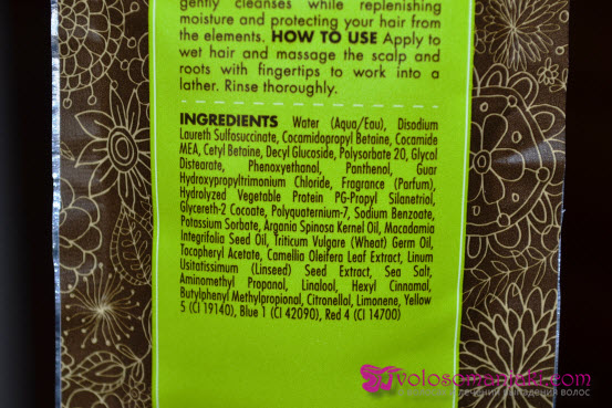 Wirkstoffe des Shampoos: Arganöl - ist ein aktives Antioxidans. Wirkt regenerierend. Sättigt mit ungesättigten Fettsäuren, schützt vor UV-Strahlen.Macadamia-Öl - ist eine Kalziumquelle, hat eine feuchtigkeitsspendende Wirkung, macht das Haar kämmbar und weich.