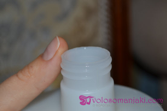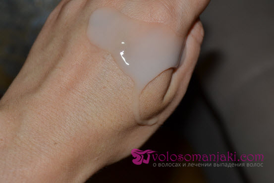 Die Konsistenz des Shampoos ist ziemlich flüssig (an der Hand sieht man, wie es sich sofort verteilt), perlmuttartige Farbe, der Geruch ist süß, chemotisch, es bleibt nicht lange auf dem Haar.