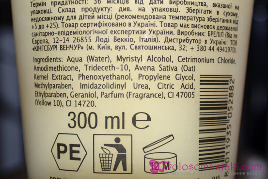 Komposition: Agua (Wasser), Merisrylalkohol, Cetrimoniumchlorid, Amodimethicone, Trideceth 10, Avena sativa (Hafer) Kernextrakt, Imidazolidinyl Urea, Methylparaben, Propylparaben, Ethylparaben, Butylparaben, Isobutylpararagben, Paroxyethanol, Zitronensäure 14720, C. I. 47005 (Gelb 10).