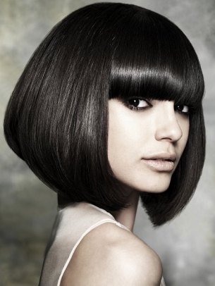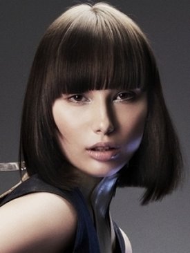 - gerader Pony bis zur Augenbrauenlinie oder Wimpern mit geradem Schnitt;