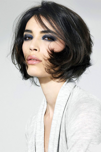 Schräger Pony kann mit einem beliebig langen kaskadierenden Haarschnitt kombiniert werden.