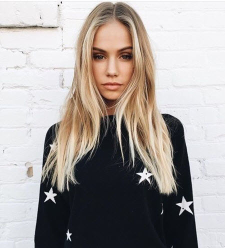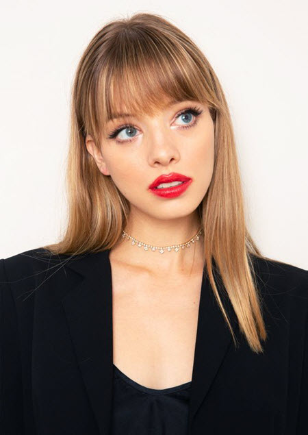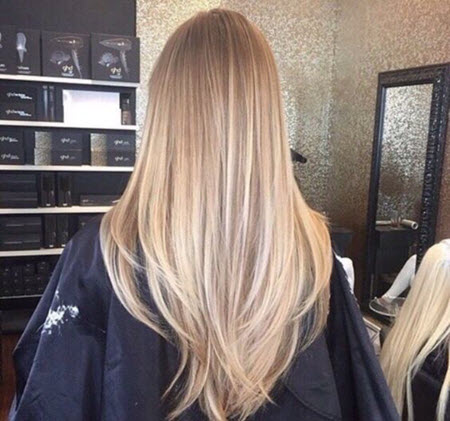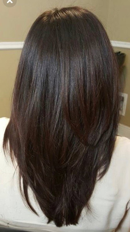 Wenn Sie sich diesen Haarschnitt ansehen, dann ist dies die gleiche Kaskade, aber nur eine etwas andere Haarschnitttechnik. Das Haar wird näher an den Spitzen kaskadiert, um ihm eine Form zu geben, und die Hauptlänge des Haares wird nicht beeinflusst. Ein V-förmiger Haarschnitt kann mit allen Arten von Pony kombiniert werden, aber ohne sieht dieser Haarschnitt nicht weniger beeindruckend aus.