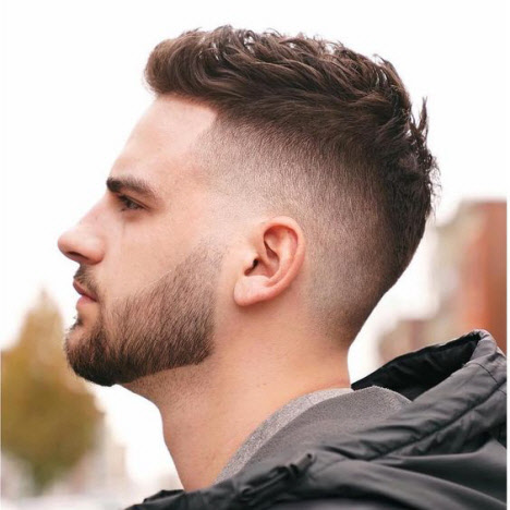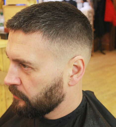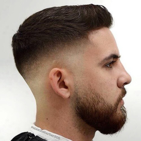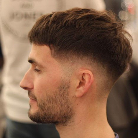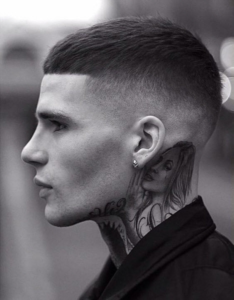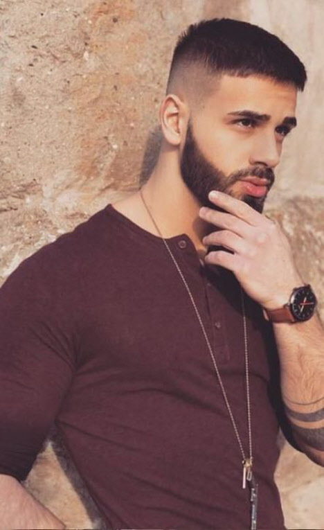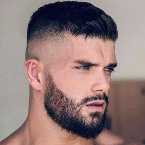 Ein Half-Box-Haarschnitt ohne Pony sieht sehr maskulin und brutal aus, besonders mit Bart. Diese Haarschnittvariante eignet sich für alle, die die Stirn optisch anheben und das Gesicht öffnen möchten.