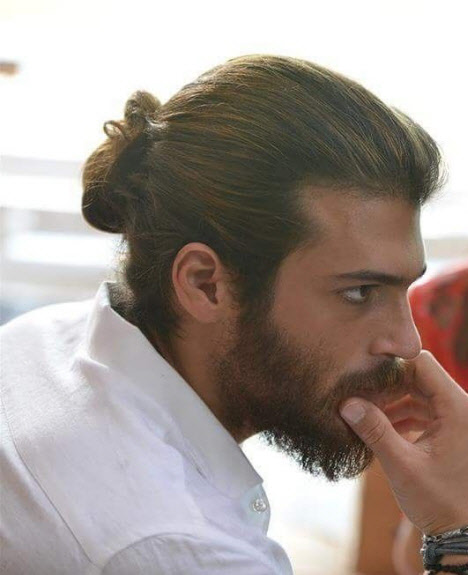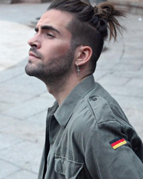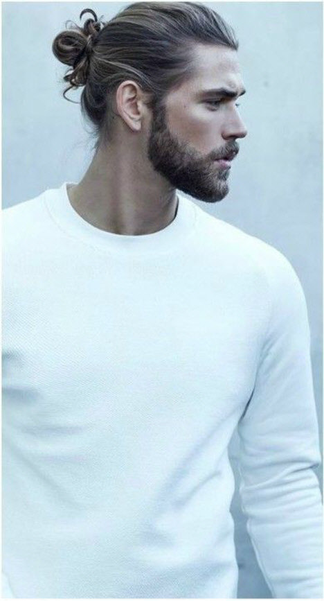 Eine Frisur mit Dutt ("Mannban"), idealerweise kombiniert mit langen Haaren oder "Undercut" und 2024 ist der Trend die rasierte Schläfenregion ("Top Knot"), im Stil der Samurai. Dabei wird ein Teil oder alle freien Haare in einem Pferdeschwanz am Scheitel oder am Hinterkopf gesammelt, aus dem ein Knoten gebildet werden kann. Ein einfacher Männer-Pferdeschwanz braucht nicht lange und ist überhaupt nicht schwer zu machen, jeder kann diese Frisur in seiner Komfortzone tragen. Mega sieht cooles Haar auf der Krone in Kombination mit einem Bart aus.