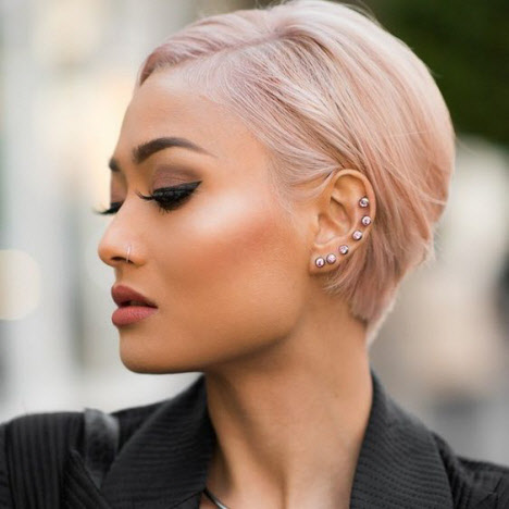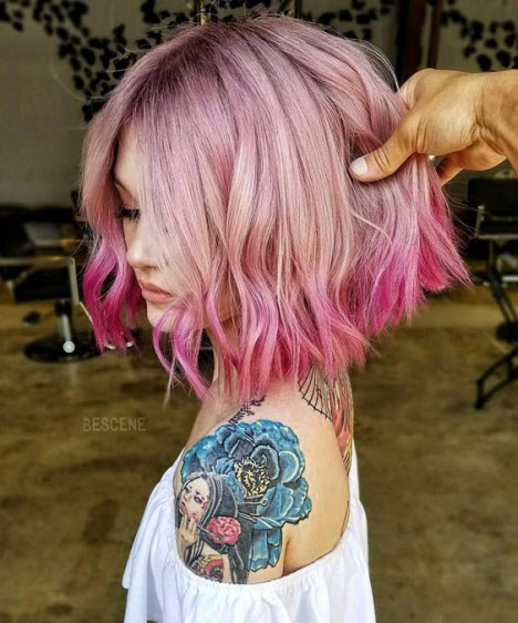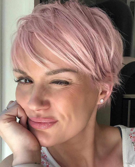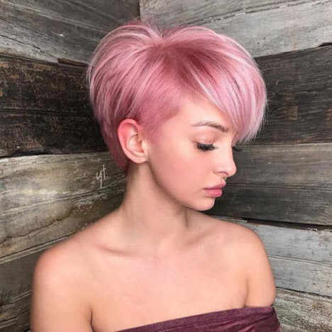 Die rosa Farbe lässt kurze Haarschnitte strukturierter und voluminöser aussehen, daher ist es eine gute Wahl. Ein kurzer Haarschnitt wächst jedoch schnell genug nach, daher muss die Färbung häufig aktualisiert werden.