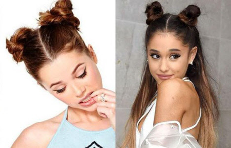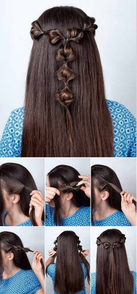 Kämmen Sie Ihr Haar in einem geraden Scheitel, trennen Sie die Haare in kleine Strähnen und machen Sie einen umgekehrten Schwanz, dann auch auf der anderen Seite alles mit dünnen Gummibändern befestigen. Zum Schluss können die Haare noch etwas gezogen werden, um Volumen zu erzeugen. Zur Verdeutlichung siehe das Foto unten: