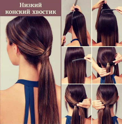 Ein niedriger Pferdeschwanz verliert nie an Relevanz, diese Frisur sieht ordentlich aus und ist in nur wenigen Minuten fertig. Für glattes Haar ist es am besten, einen Pferdeschwanz zu machen. Trennen Sie einen Teil des Haares von oben und fixieren Sie ihn mit einer Haarklammer (wie auf dem Foto unten). Flechten Sie den Schwanz hinten. Mit den restlichen ungeflochtenen Haaren das Gummiband schließen und im Kreuzmuster befestigen.