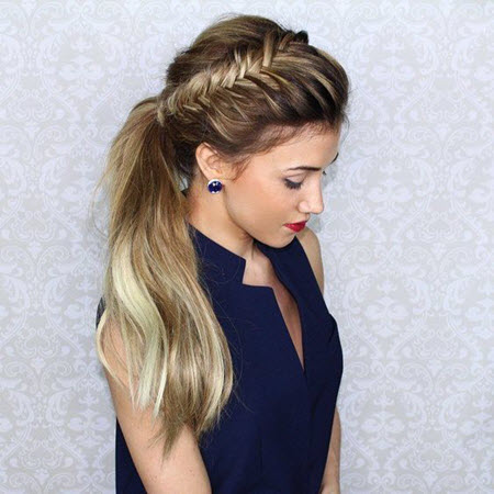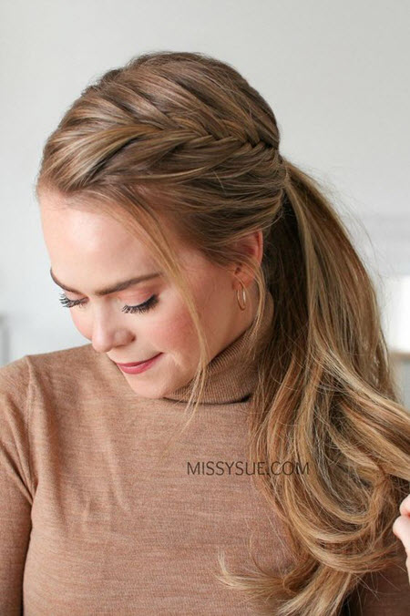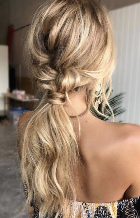 - Aus dem Schwanz einen voluminösen Zopf flechten und mit einem dünnen transparenten Gummiband befestigen