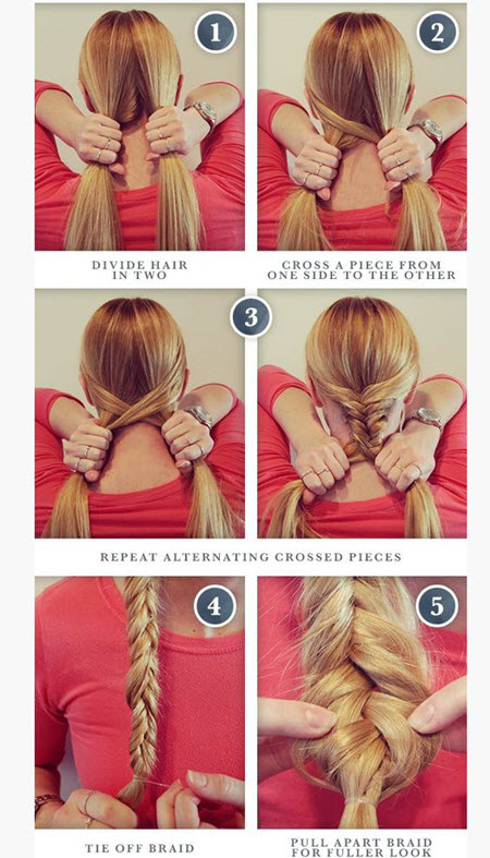 - Flechten Sie einen Fischschwanz aus dem Schwanz: Teilen Sie das Haar in zwei Teile und schlagen Sie von jedem Teil abwechselnd dünne Strähnen und kreuzen Sie sie mit der gegenüberliegenden Seite.