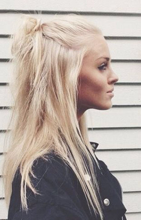 Ziehen Sie Ihre Haare zu einem hohen Pferdeschwanz und drehen Sie einen unordentlichen Knoten, oder Sie können die Haarsträhnen für einen lässigeren Look ein wenig ausstrecken.