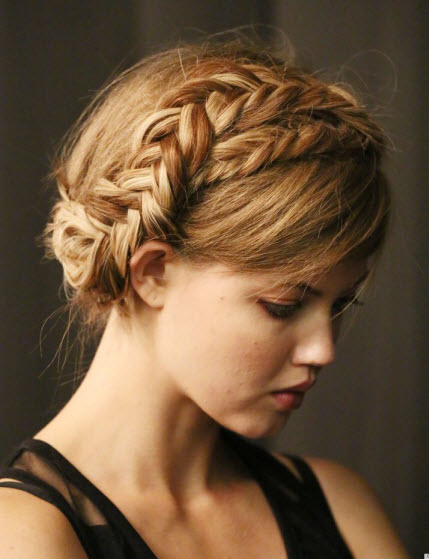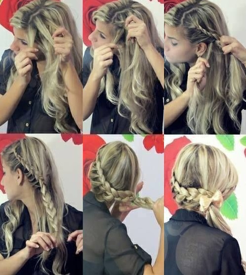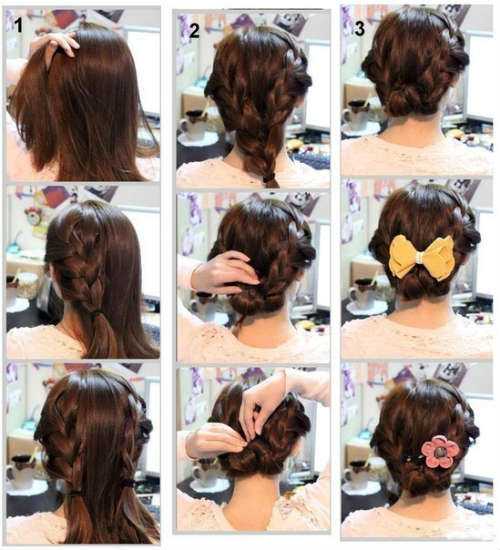 Eine weitere Option für ein Brötchen für eine festlichere Option ist ein Brötchen mit einem Zopf, unten sind Optionen für solche Frisuren.