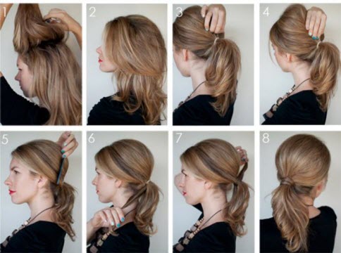 Machen Sie zuerst einen hohen Pferdeschwanz, ziehen Sie dann einen Bagel an, ohne die Mitte des Haares zu erreichen, und senken Sie den Bagel bis zum Ansatz des Schwanzes ab, indem Sie Ihr Haar um ihn wickeln, wie auf dem Foto unten: