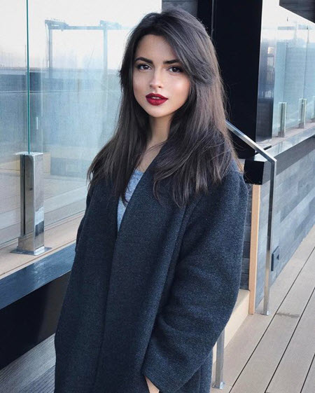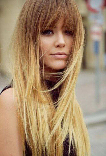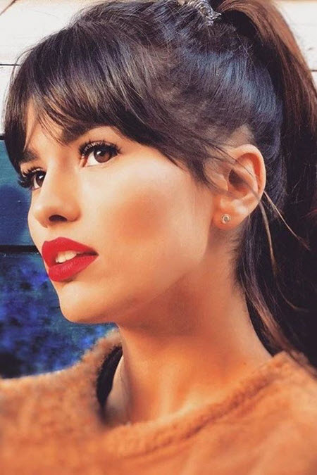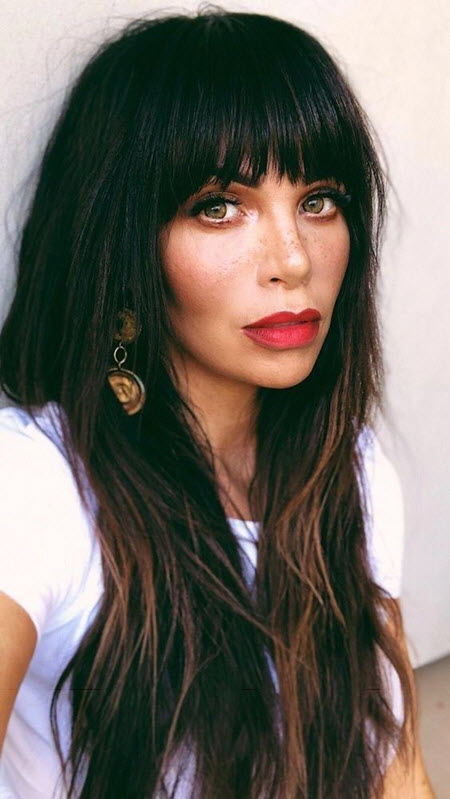 Quadratische Gesichtsform - Sie können verschiedene Haarschnitte für langes Haar wählen, konzentrieren Sie sich auf Pony. Dicke und gerade Pony bis zu den Brauen sind eine gute Option oder bedecken Sie die Brauenlinie, je nachdem, was für Sie bequemer ist.