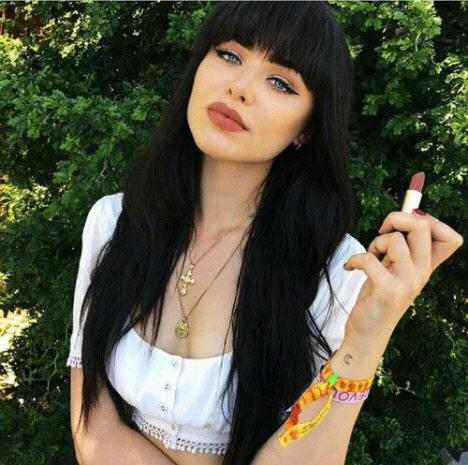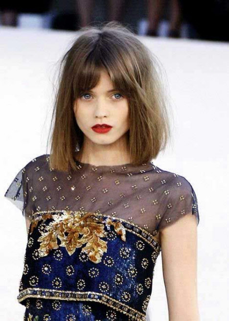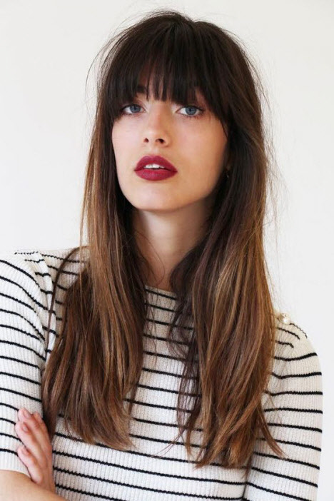 Gerader gerader Pony. Dieser Pony ist ideal für diejenigen mit glattem Haar, aber für einen solchen Pony benötigen Sie gesundes, dickes Haar, da dieser Pony nicht für dünnes dünnes Haar geeignet ist. Dies gilt auch für lockiges und lockiges Haar.