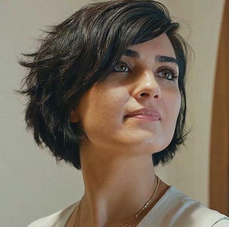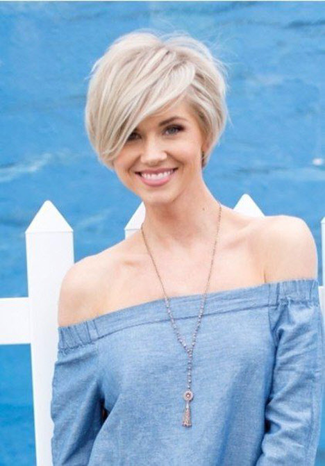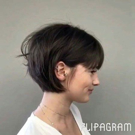 Modischer schräger Pony auf der Seite ist ein heißer Trend des Jahres 2024 bei Haarschnitten für kurzes Haar.