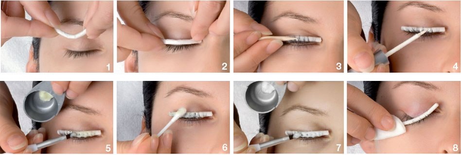 - Im nächsten Schritt wird ein spezielles Öl zur Wimpernpflege aufgetragen, das 5 Minuten auf dem Oberlid belassen wird. Abschließend wird mit einem speziellen Pinsel ein reinigendes kosmetisches Präparat (Clinser) auf die gekräuselten Flimmerhärchen aufgetragen, das die Reste aller während des gesamten Verfahrens verwendeten Weichmacher und Fixiermittel vom oberen Augenlid entfernt.