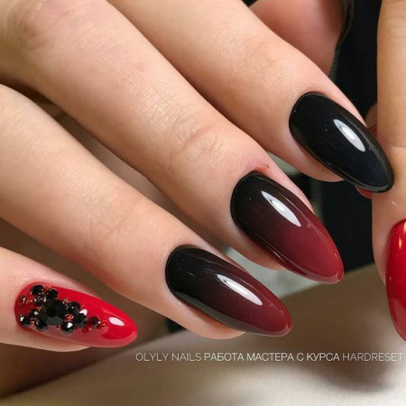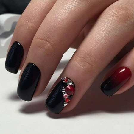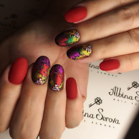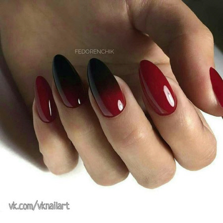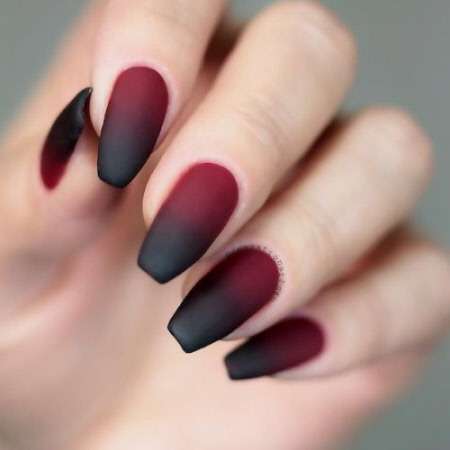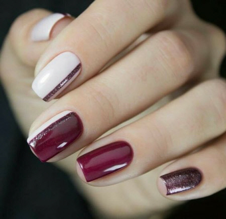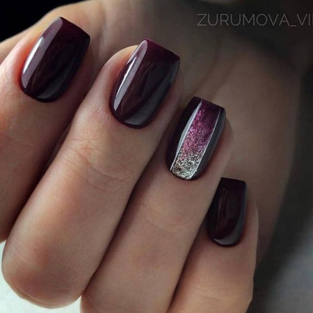 Zwei dunkle Farben zusammen - klingt ziemlich interessant und ungewöhnlich, sieht aber in der Maniküre sehr stylisch aus. Ein tiefer Burgunderton gepaart mit mattschwarzem und silbernem Glitzer wird in dieser Saison auf Ihren Nägeln schick aussehen.