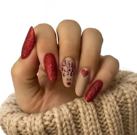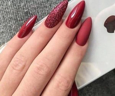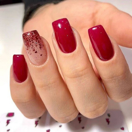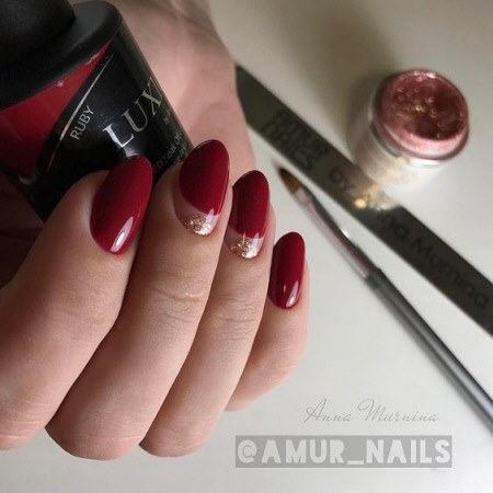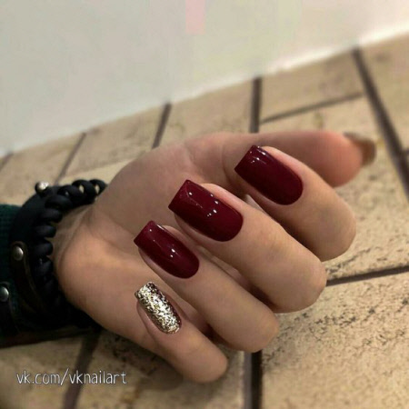 Glitzermaniküre ist immer angebracht, unabhängig von der Jahreszeit und Jahreszeit. Eine burgunderrote Maniküre mit Funkeln wird sehr schön auffallen und auf den Nägeln schimmern und die Aufmerksamkeit auf Ihre Hände lenken. Gold- und Silberpailletten werden die burgunderrote Farbe der Maniküre in den Jahren 2024-2025 perfekt ergänzen.