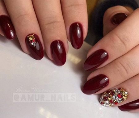 Burgunder Nageldesign mit Steinen und Strasssteinen: Foto 2024-2025