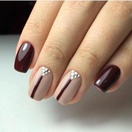 In Kombination mit der Farbe Burgunder sehen die Strasssteine zauberhaft aus, daran besteht kein Zweifel. Je dunkler der Farbton, desto besser unterstreicht er die Schönheit der Steine. Darüber hinaus müssen Sie nicht zu weit gehen, selbst das einfachste Kieselmuster wird in Kombination mit Burgunder-Tönen in der Nailart-Saison 2024-2025 großartig aussehen.