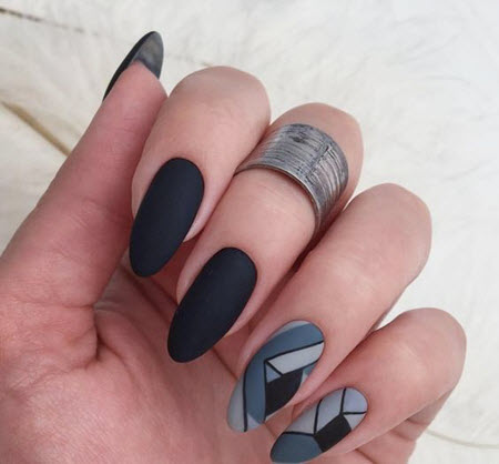 Eine Geometriemaniküre ohne schwarzen Lack ist schwer vorstellbar, da alle Akzentelemente mit seiner Hilfe hergestellt werden. Aber oft wird Schwarz als Grundlage für das Geometriedesign gewählt und dies wird 2024 ein unbestrittener Trend sein. Besonders beeindruckend wirkt das schwarze Geometrie-Design in mattem Top.