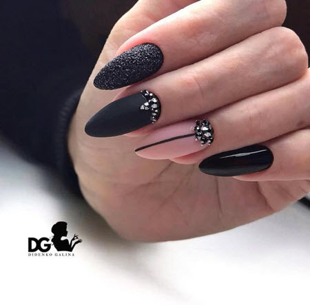 Foto von schwarzer Maniküre mit Glitzern und Strasssteinen