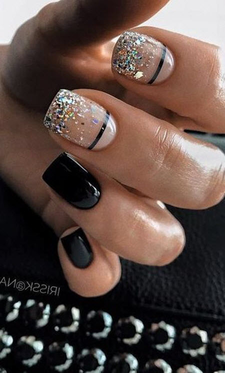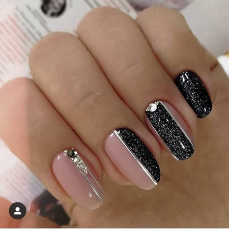 Wenn Sie 2024 ein wenig Glanz hinzufügen möchten, dann ist schwarzer Lack perfekt für diese Nailart. Die schwarze Basis ist für sich allein schon auffällig, aber das Hinzufügen von Glanz verleiht sofort Helligkeit und Chic. Man kann mit Sicherheit sagen, dass Glitzer mit dieser Farbe schöner aussieht als mit jeder anderen Lackfarbe. Dies liegt daran, dass Schwarz die Pailletten verstärkt und einen guten Hintergrund für die darüberliegenden Pailletten schafft. Schwarzer Lack passt zu allen Arten von Pailletten und Farben.