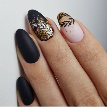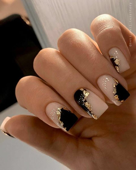 Schwarze und goldene Nägel sehen erstaunlich raffiniert aus. Dieses Nageldesign wird Sie nie im Stich lassen oder enttäuschen. Im Jahr 2024 wird schwarze Maniküre in Kombination mit Gold einer der angesagtesten Trends in der Nagelkunst sein. Die schönste Auswahl dieser eleganten Maniküre finden Sie auf dem Foto unten: