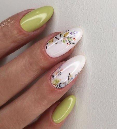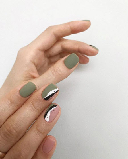 Die Kombination von Grün in einer Maniküre beinhaltet die Verwendung von Gold, Braun, Creme, Weiß, Schwarz und Salat.