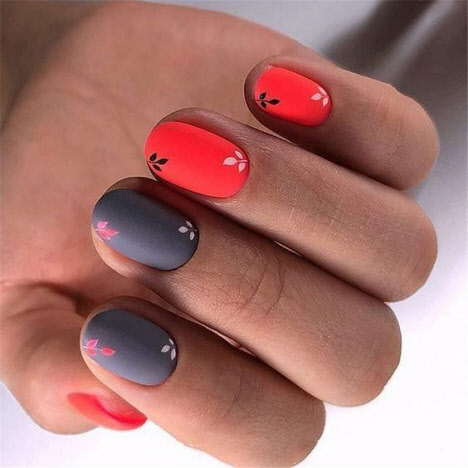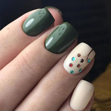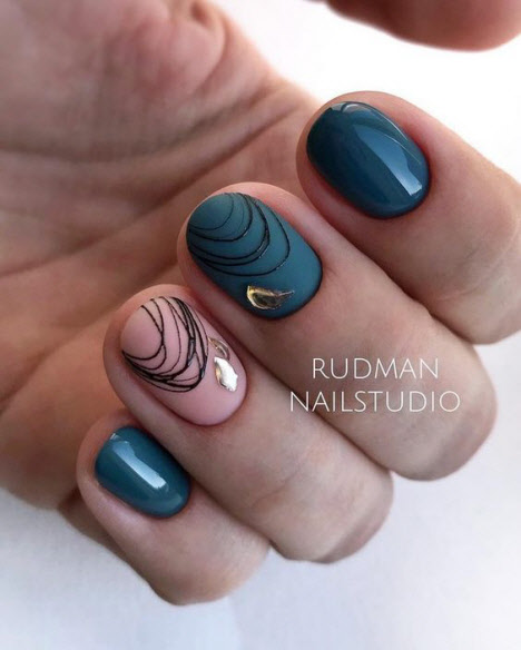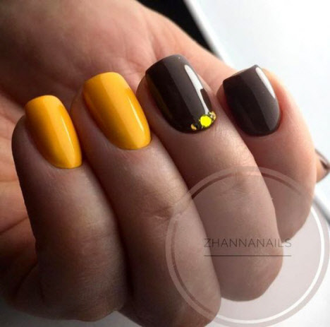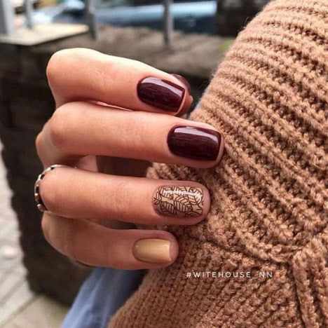 Der Herbstanfang ist voller saftiger, dicker, gesättigter Farben, Farben in Rot-, Oliven-, Gold-, Braun- und Dunkelgrüntönen, die für die Maniküre verwendet werden können. Gegen Ende wünscht man sich kältere Farben, Lacke mit Weiß-, Grau-, Perlmutt-, Silber-, Blau- und Schwarztönen treten in den Vordergrund. Fangen Sie Ideen für eine interessante Herbstmaniküre für kurze Nägel: