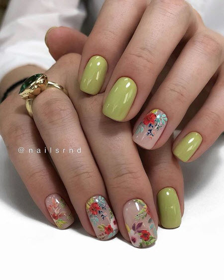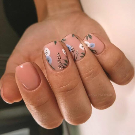 Die Frühlings- und Sommermaniküre ist ohne florale Nageldesigns kaum vorstellbar. Wählen Sie im Jahr 2024 Zeichnungen mit floralem Design auf einer pastellfarbenen Gelpoliturbasis in Nude.
