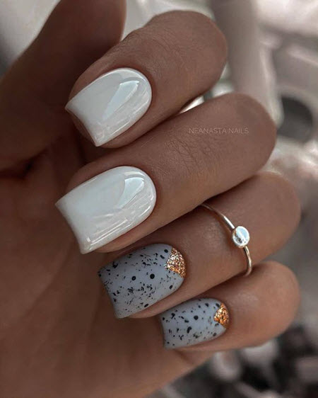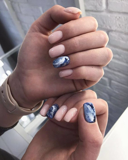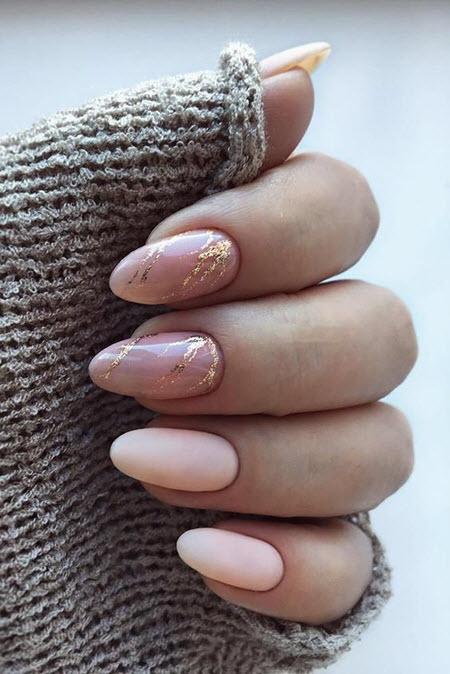 Eine solche Gelpolitur-Maniküre sieht zu jedem Anlass schön aus: eine Nude-Basis, ein Akzent-Ringfinger, auf dem Marmor mit Folienelementen wunderschön aussieht.