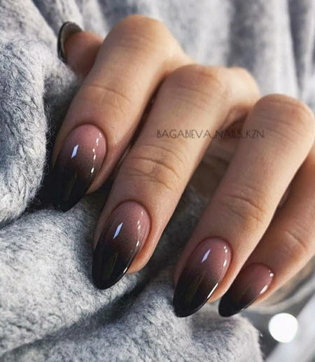 Ombre-Nageldesign wird auch 2024 in Mode sein, nur in dieser Saison bevorzugen Sie keine Pastelltöne, sondern wählen satte dunkle Farben, die an der Nagelspitze heller werden.
