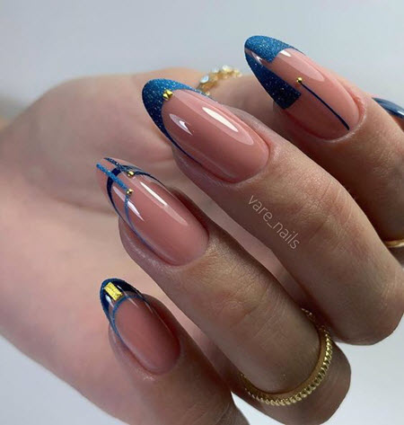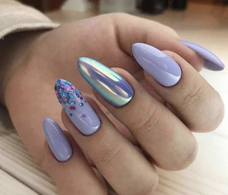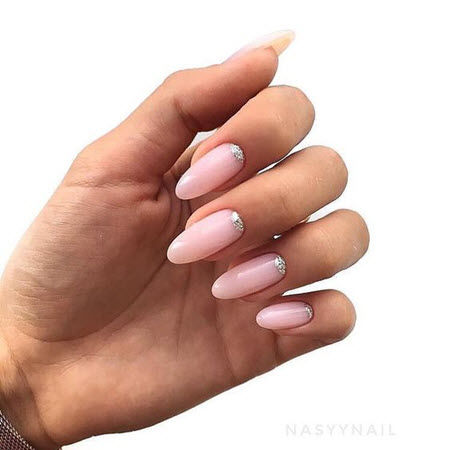Eine Glitzer-Maniküre wäre eine tolle Idee für ein trendiges Mandel-Nageldesign. Glitter kann auf ein oder zwei Nägel in Form eines Akzents aufgetragen werden, der den gesamten Nagel damit bedeckt, oder Sie können auf jedem Nagel ein interessantes minimalistisches Design machen. Außerdem wird Glitzer oft mit anderen Maniküretechniken (Reiben, Folie, Zeichnen) kombiniert.