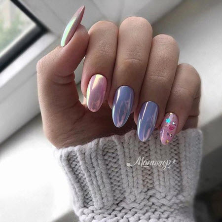 Es ist am besten, die Steine auf einen Nagel aufzutragen und sie in einem schönen Muster zu verlegen, oder Sie können die gesamte Nagelplatte abdecken, um eine größere Wirkung zu erzielen. Eine Maniküre mit Strasssteinen kann in jedem Farbton der Palette erstellt werden. Wählen Sie die Farbe des Lacks unter Berücksichtigung der Jahreszeit, des Kleidungsstils und des Grundes für die Maniküre.