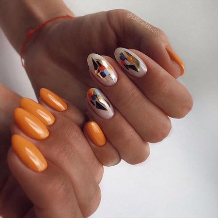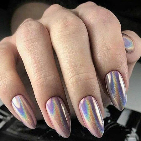 Wenn Sie nicht wissen, welches Design Sie 2024 für Mandelnägel wählen sollen, probieren Sie unbedingt eine Maniküre mit Folie aus. Eine solche Maniküre sieht auf mandelförmigen Nägeln sehr stilvoll aus, und siehe das Foto für die modischsten Gestaltungsmöglichkeiten: