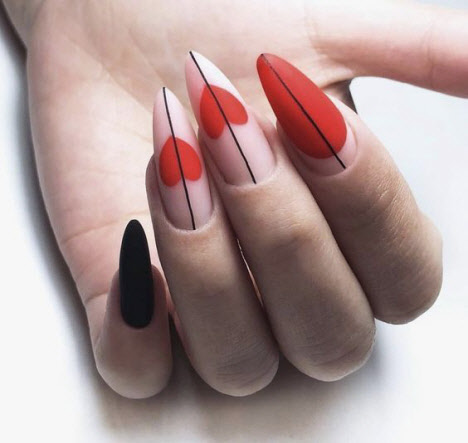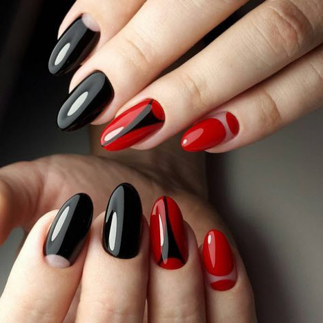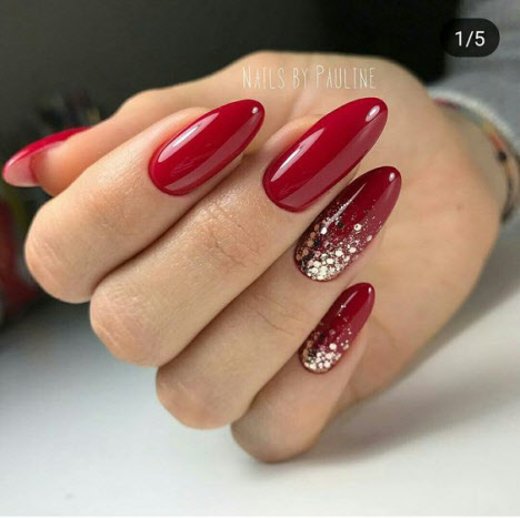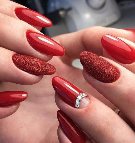 Rote Maniküre sieht in einem monochromatischen Design wunderschön aus, kann aber auch mit weißem Lack, Gold, Schwarz, Glitzern, Reiben und sogar Kieselsteinen sicher verdünnt werden.