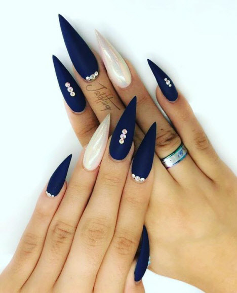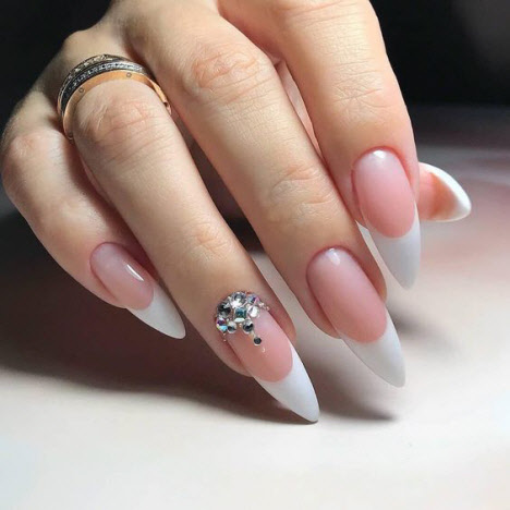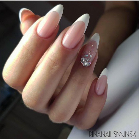 Die scharfe Form der Nägel verlängert die Finger optisch sehr gut und macht sie etwas dünner. Auf Nägeln dieser Form sehen Kiesel, Reiben, Funkeln sehr schön aus. Maniküre sieht sowohl in hellen als auch in helleren auffälligen Farben vorteilhaft aus.