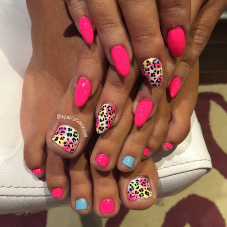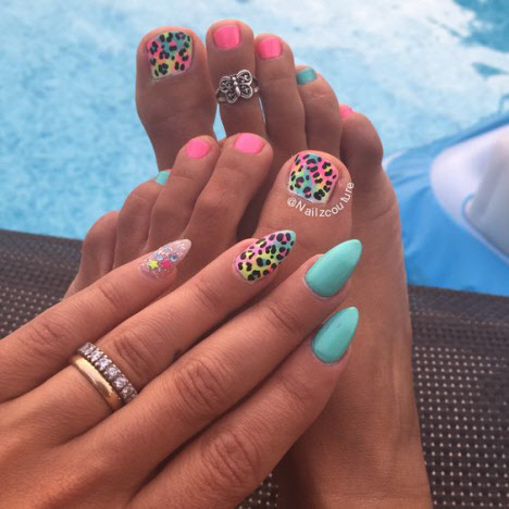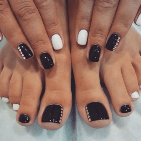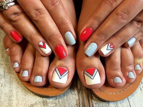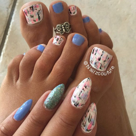 Wir bieten Ihnen ein Foto der Neuheit von Maniküre und Pediküre im gleichen Stil, interessante Kombinationen von Lackfarben, Techniken und Anwendungstexturen.